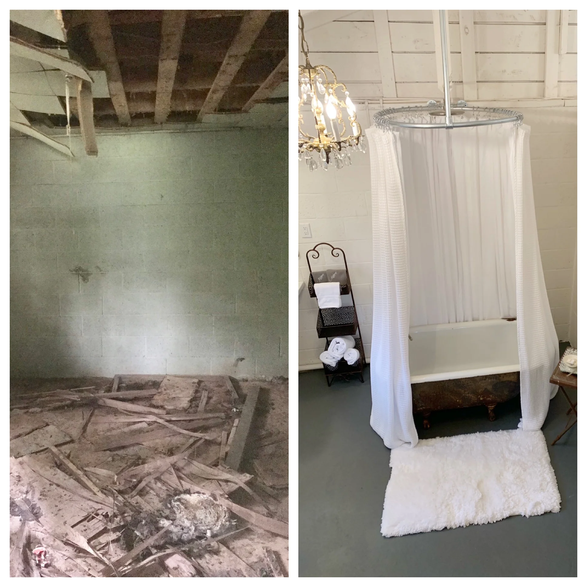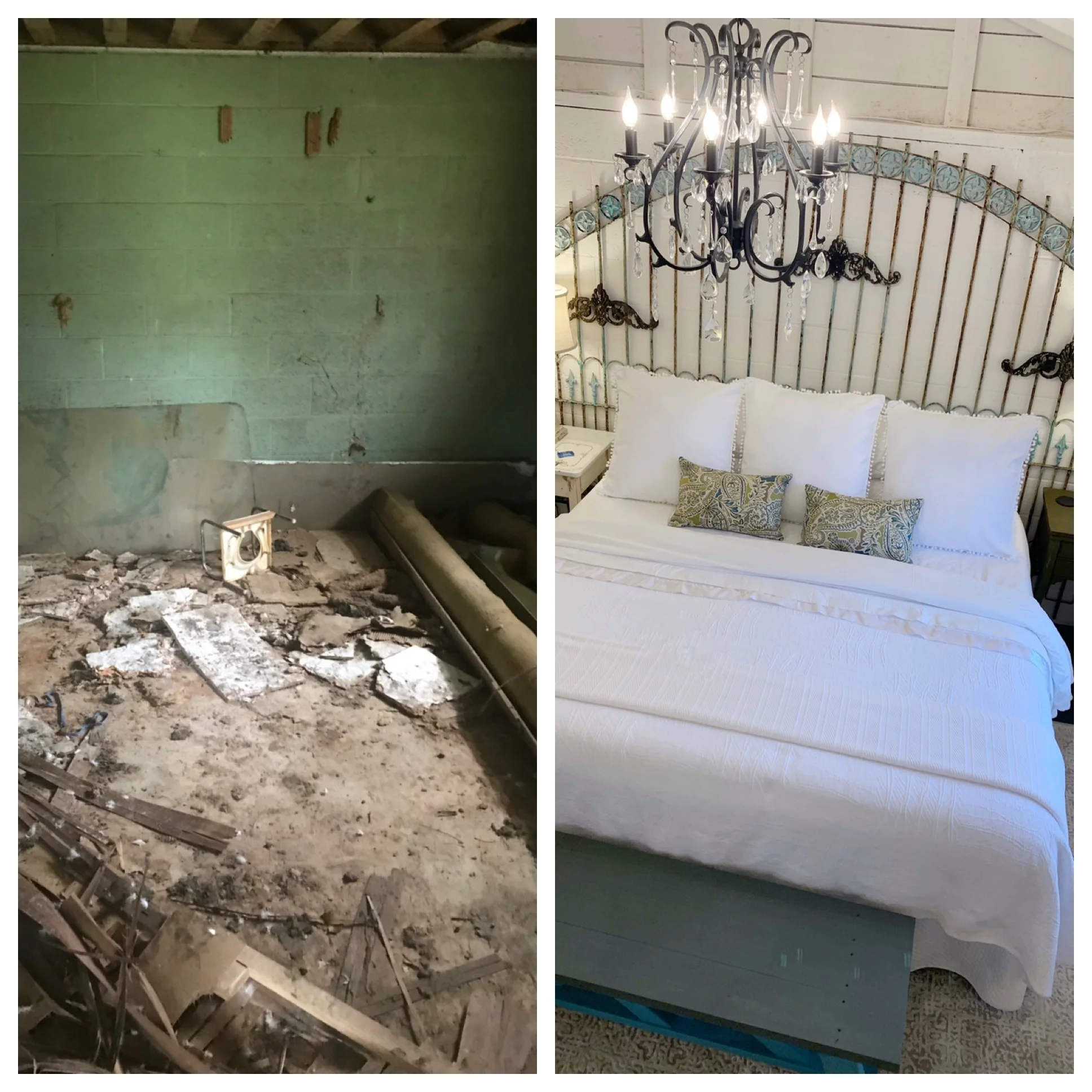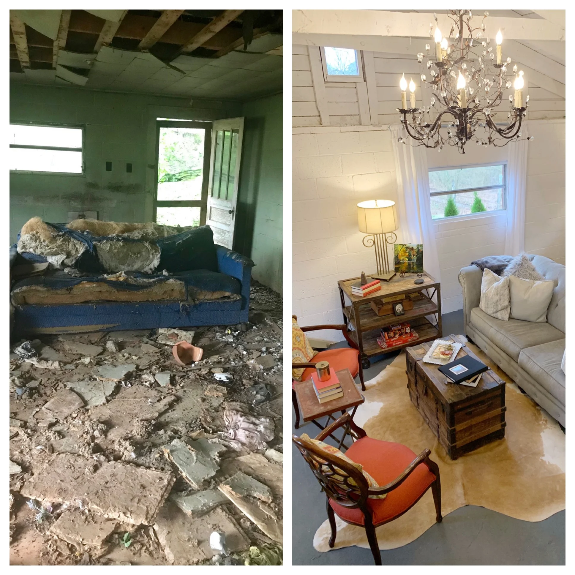 /there was a little cinder block cottage that sat on our family farm. Currently, we are a working cattle farm but at one time we were farming poultry, cattle, timber, corn for liquor, a grist mill and a sawmill. Farming was not automated at that time so it took many hands to keep it running from day to day. The cottage was originally built as a home for a family that was hired help at Green Hill Farm. It did not have indoor plumbing and only four electrical receptacles. There was an outhouse for a bathroom, a wooden cookstove, and a well for drawing water. In 1970 automation started arriving and hired help was not as necessary. Not to mention I was 5 by this time and was quickly put to work on the farm. The cottage sat empty for decades. It was the playhouse for the Ferguson grandchildren then a storage building for farm equipment finally ending as a cow parlor. After the newest Ferguson farmhouse was built on Shutterbug Lane, I started reclaiming the cottage. It was a collective agreement from nearly everyone in my life that the cottage was considered beyond repair and should be “burned down”. Luckily I didn’t listen. I do design for hire and I love it when a job is really difficult. I love a challenge. So I began a massive cleaning project to do the unthinkable. A lot of love later the Chandelier Cottage was completed on December 22, 2018 and had it’s first Airbnb renters on December 30, 2018.